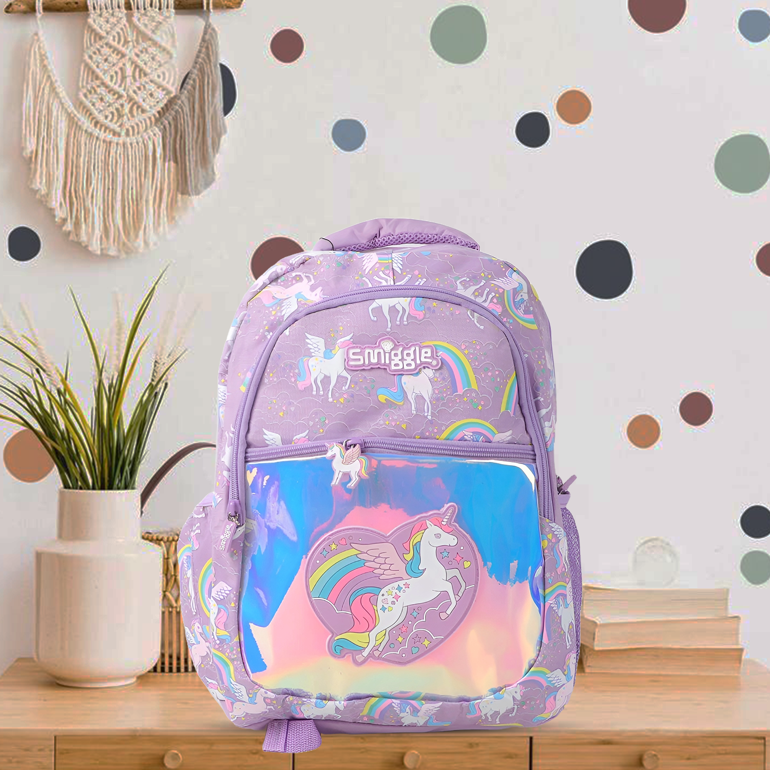 Transport your essentials in style with the Smiggle - 16 inch Premium Purple unicorn Backpack. Made with durable materials, this backpack features a playful unicorn design that is sure to make you stand out. With its spacious compartments and comfortable straps, it's the perfect blend of fashion and functionality. Perfect for students and travelers alike!