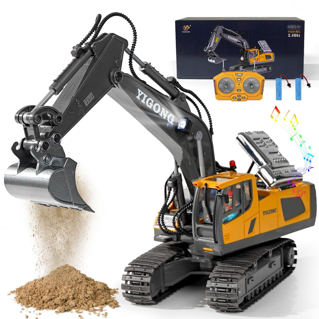 Introducing the Yigong 11 CH Remote Control 1:18 scale die cast excavator. Boasting 11 channels of remote control and a 1:18 scale die cast design, this excavator offers precise and realistic maneuverability. With its durable construction, it can handle heavy duty digging tasks with ease. Experience the convenience and accuracy of remote control with the Yigong excavator.